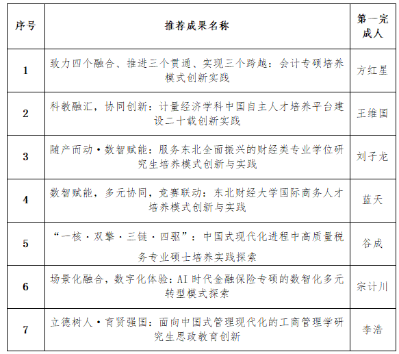 根据辽宁省教育厅《关于举办 2026 年辽宁省普通高等教育研究生教学成果展示大赛的通知》(辽教通〔2026〕76 号)及相关评选工作要求,深化我校研究生教学改革与创新,促进研究生教学形成突破性成果,经学校组织申报及校内外专家评审,择优推荐《致力四个融合、推进三个贯通、实现三个跨越:会计专硕培养模式创新实践》等 15 项优秀研究生教学成果参评辽宁省普通高等教育研究生教学成果展示大赛。具体名单公示如下: